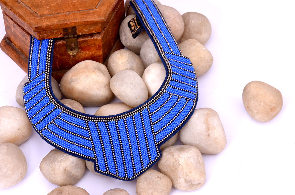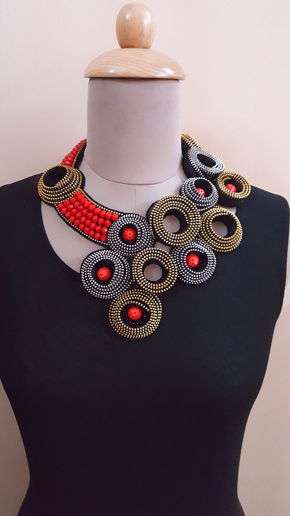Inspired the Egyptian bibs. Intricate Bead-work is outlined by Metallic Zips reflecting the Egyptians love for bright and bold jewellery