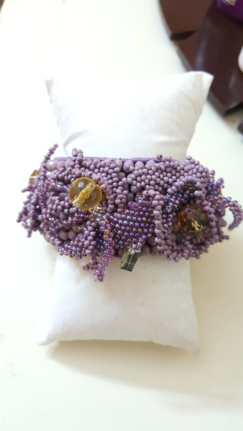 beautiful ribbed agates are used along side carnelians, citrine icicles and MOP rings as well as rose quartz. Lazer cut Brass filigree has been stitched on to luxurious velvet for a metallic accent. Various elements have been carefully strewn to give the impression of machinery including a KEY.
